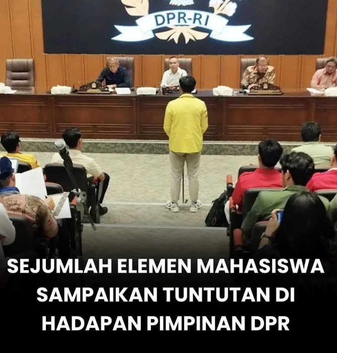 Sejumlah elemen organisasi mahasiswa dari berbagai kampus, mulai dari badan eksekutif mahasiswa (BEM) hingga organisasi ekstra kampus, menyampaikan aspirasi mereka langsung kepada pimpinan DPR RI di kompleks parlemen, Jakarta, Rabu (3/9). Pertemuan tersebut digelar di ruang Abdul Muis Gedung Nusantara atau yang dikenal sebagai “gedung kura-kura”, dihadiri antara lain oleh Wakil Ketua DPR RI Sufmi Dasco Ahmad serta anggota pimpinan dewan Saan Mustopa dan Cucun Ahmad Syamsurijal. Dalam forum tersebut, para perwakilan mahasiswa bergiliran menyampaikan tuntutan yang telah dihimpun, termasuk mengingatkan adanya “17+8 tuntutan rakyat” yang belakangan marak disuarakan melalui media sosial. Para mahasiswa menegaskan bahwa suara mereka mewakili keresahan masyarakat atas berbagai persoalan bangsa yang membutuhkan perhatian serius parlemen. Penyampaian aspirasi ini diwarnai dengan diskusi intens antara mahasiswa dan pimpinan DPR, mencerminkan dinamika demokrasi di mana kaum muda memanfaatkan ruang partisipasi politik untuk menyuarakan kepentingan rakyat secara langsung.